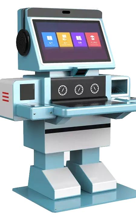 远望谷少儿自助借还书机,从儿童生理发展特点出发,采用卡通机器人造型,运用明亮的颜色吸引孩子的眼球。
